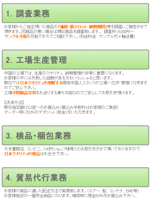 大手量販店、コンビ二、100円ショップ様等とのお取引をさせて頂いておりますので、日本クオリティの検品はお任せ下さい。